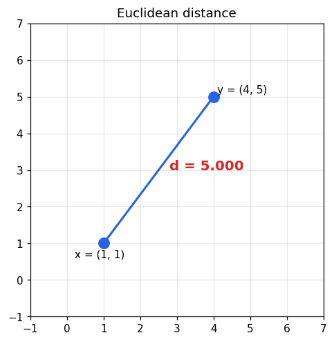 두 벡터 의 유클리드 거리는 다음과 같이 정의됩니다: