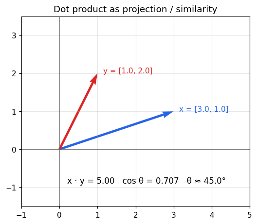 두 벡터의 내적은 두 벡터가 얼마나 같은 방향을 향하는지 나타내는 값입니다. 머신러닝에서는 거의 모든 연산의 기본 재료 — 유사도(cosine similarity), 선형 모델 예측(), 사영 모두 내적으로 쓰입니다.