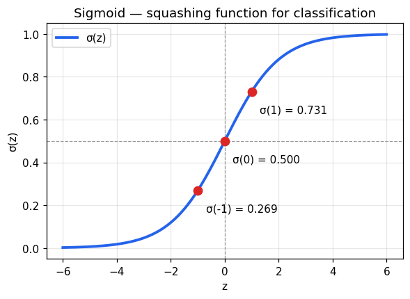 실수 전체 R 을 (0,1) 구간으로 눌러주는 S자 곡선. 로지스틱 회귀, 이진 분류의 확률 출력, 신경망의 고전적 활성화 함수로 쓰입니다.