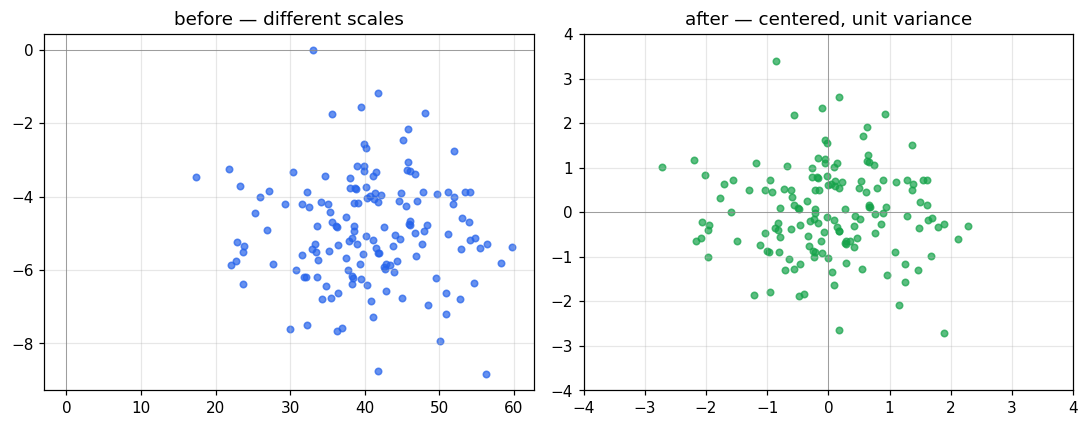 특성 간 스케일이 다르면 거리 기반 모델(KNN, SVM)과 경사하강 기반 모델(로지스틱 회귀, 신경망)이 특정 특성에 편향됩니다. 각 열을 평균 0, 표준편차 1로 맞춰주는 게 표준화: