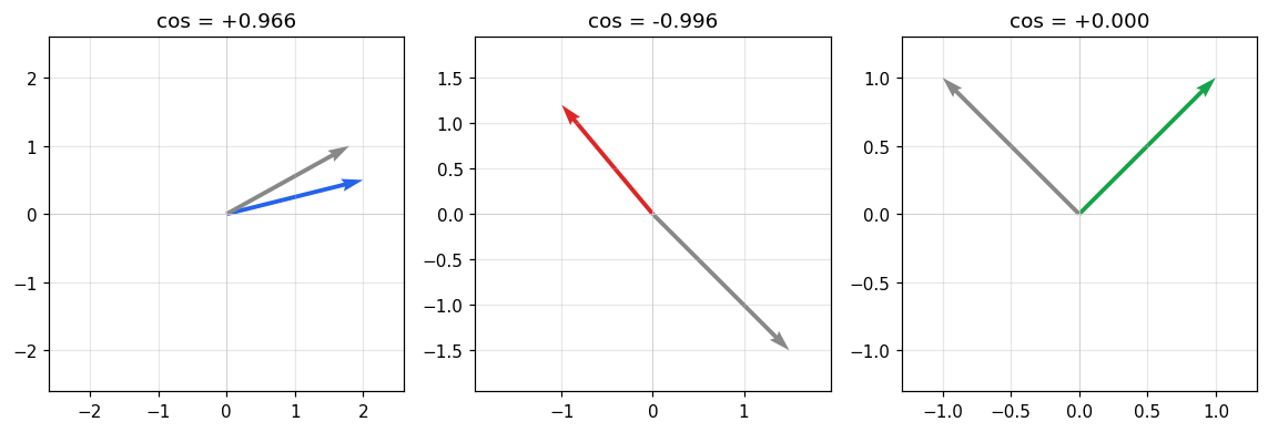 두 벡터의 각도만 비교하는 유사도. 크기(norm)를 제거하므로 방향이 비슷한지만 봅니다. 문서·임베딩 비교에서 기본 도구: