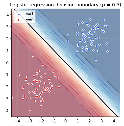 X shape (N, D), y shape (N,) with {0, 1}.w = 0 (D,), b = 0.n_steps 회 경사하강. for 루프 OK.(w, b) — w (D,) NumPy 배열, b float.| # | 이름 | 검증 |