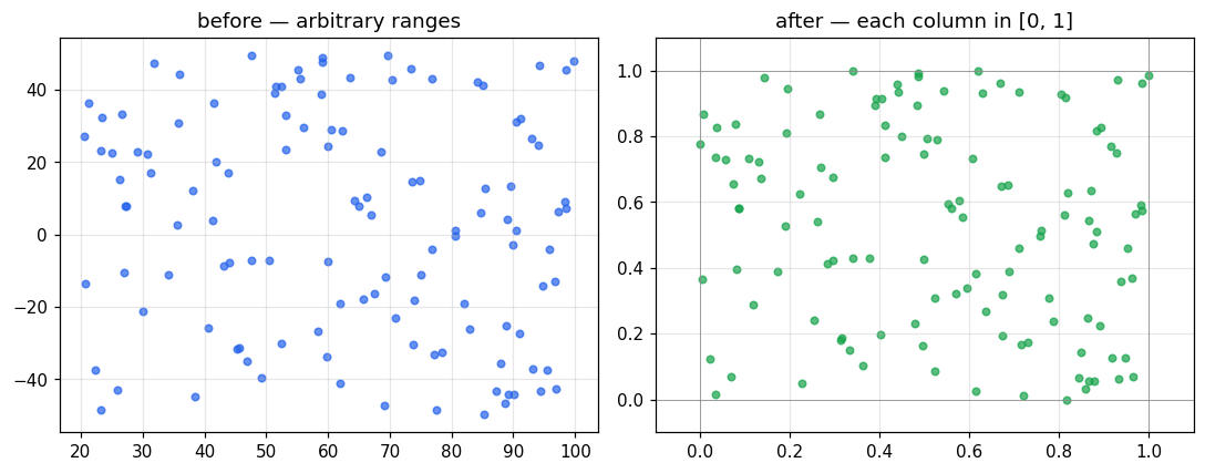 각 특성을 [0, 1] 구간으로 선형 변환하는 대표적 스케일러. Z-score와 달리 한정된 범위를 보장합니다 — 이미지 픽셀, 확률 기반 입력 등에서 유용.