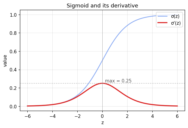 - σ′(0)=0.25 — 최댓값