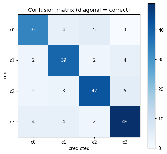 C[i, j] = 실제 클래스 i 를 j 로 예측한 샘플 수. 대각선은 정답, 비대각선은 오답.