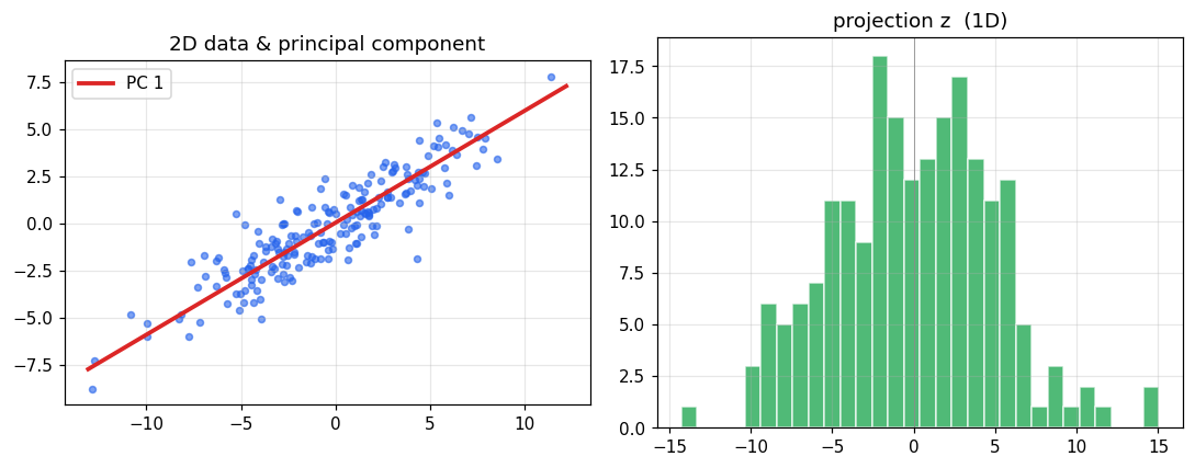 (pc, z) — pc shape (D,) 단위벡터, z shape (N,) 투영값.np.linalg.eigh 는 오름차순으로 고유쌍 반환 → 마지막 열이 가장 큰 방향.| # | 이름 | 검증 |